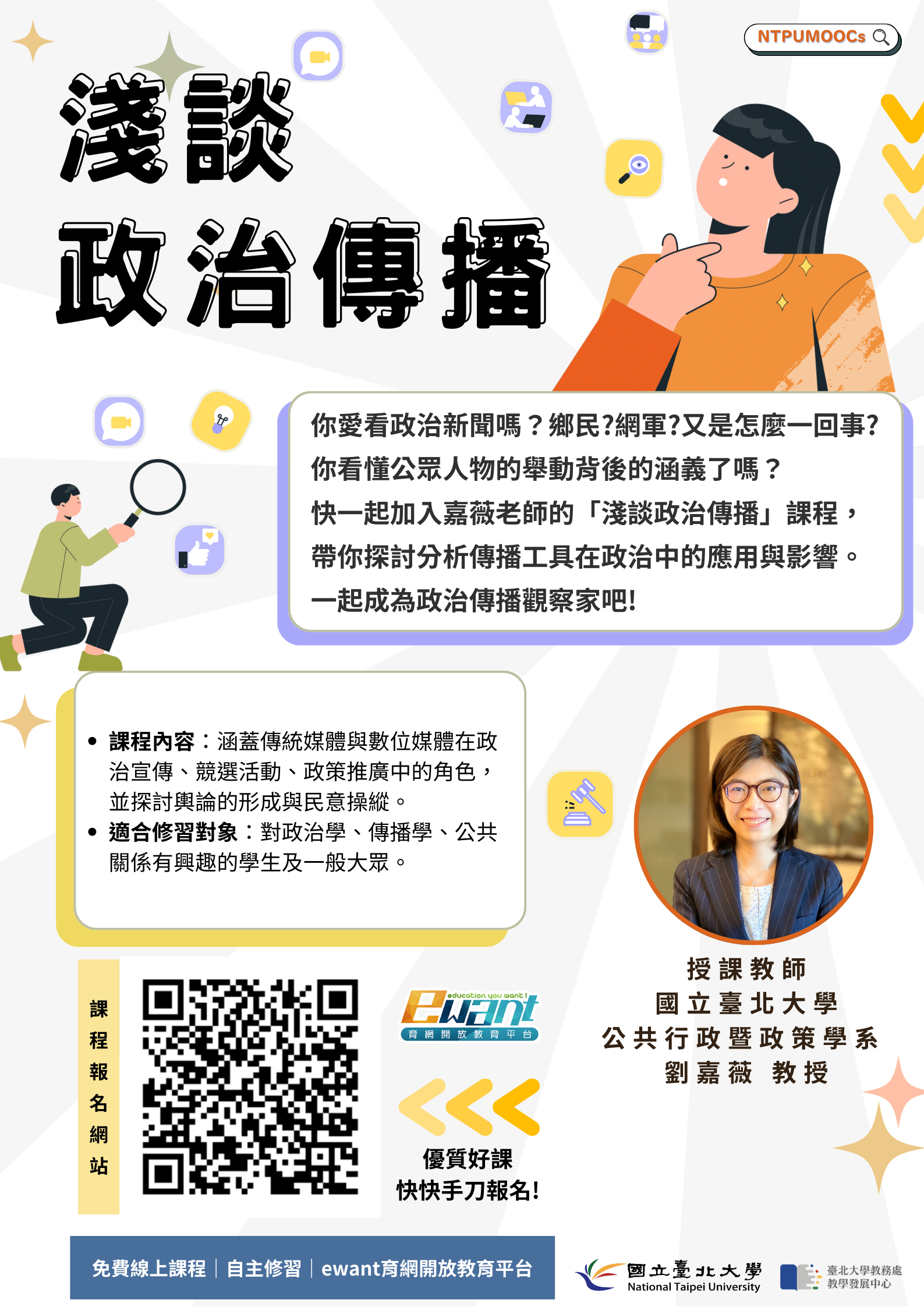 一、本課程由本校公共行政暨政策學系劉嘉薇教授授課,修習 本課程可以了解傳統媒體與數位媒體在政治宣傳、競選活 動、政策推廣中的角色,並探討輿論的形成與民意操縱, 及分析各種傳播工具在政治中的應用與影響。 二、課程資訊 (一)課程全程免費,不限修課對象。 (二)報名方式:本課程於「ewant育網開放教育平台」開課, 請學員先於此平台註冊個人帳號(http://www.ewant.org /),即可選課。 (三)課程網址:https://reurl.cc/36jDk9。 (四)開課時段:即日起至114年1月17日。 三、檢附本課程海報電子檔。 四、聯絡窗口:教務處教學發展中心 張韻婷助理:電話:02- 8674-1111分機66236、電子信箱yunting@gm.ntpu.edu. tw。