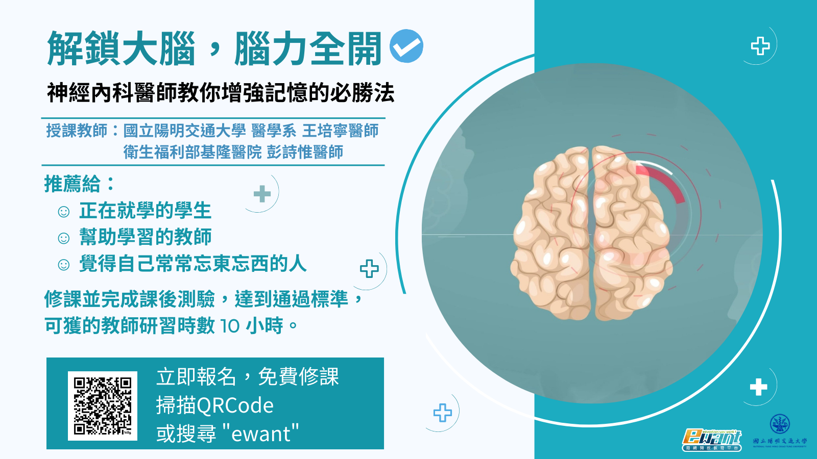 一、旨揭課程由本校醫學系王培寧醫師與基隆醫院彭詩惟醫 師,製作「解鎖大腦,腦力全開」全線上數位課程,傳遞 活用大腦的正確認知,打造有效的學習方法。 二、課程針對非醫學背景民眾進行設計,特別適合給學生、教 師、常常用腦的上班族,讓民眾能夠清楚了解腦神經運作 方式,以及活用大腦、增強記憶的方法。 三、修習該課程、作答課後測驗並達到課程通過標準,可獲得 教師研習時數 10 小時。欲取得教師研習時數之教師,請 於 ewant 註冊帳號,並報名課程後,至課程的第一週「中 小學教師進修時數填報處」的Google表單填報個人資料。 四、報名課程與課程資訊請見 ewant 育網開放教育平台了解: https://bit.ly/2024BrainPower2。 五、課程報名日期:即日起至 2025年1月31 日止。 六、課程聯絡人:本校高等教育開放資源研究中心林先生,(03) 5712121 分機56065,email:ericlin@nycu.edu.tw。