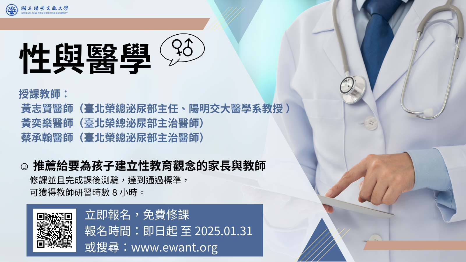 一、旨揭課程由黃志賢醫師主授(臺北榮民總醫院泌尿部主 任、國立陽明交通大學醫學系教授),邀集臺北榮總的專 業泌尿科主治醫師,以生殖醫學出發,製作「性與醫學」 全線上數位課程,以利推動正確的衛教資訊。 二、課程探討性別與男性生殖系統、賀爾蒙對人體的影響、男 性生殖功能障礙、不孕症,並釐清性與醫學上的迷思。讓 參與民眾能夠清楚了解性教育與性別教育、常見生殖相關 疾病的病生理,並可讓中小學教師能夠向學生傳遞正確的 生物與性教育觀念。 三、修習該課程、作答課後測驗並達到課程通過標準,可獲得 教師研習時數8小時。欲取得教師研習時數之教師,請於 ewant 註冊帳號,並報名課程後,至課程的第一週「中小 學教師進修時數填報處」的Google表單填報個人資料。 四、課程報名日期:即日起至2025年1月31日止。 五、報名課程與課程資訊請見 ewant 育網開放教育平台了解: https://bit.ly/2024Urology2。 六、課程聯絡人:高等教育開放資源研究中心林先生,(03) 5712121分機56065,電子郵件:ericlin@nycu.edu.tw。