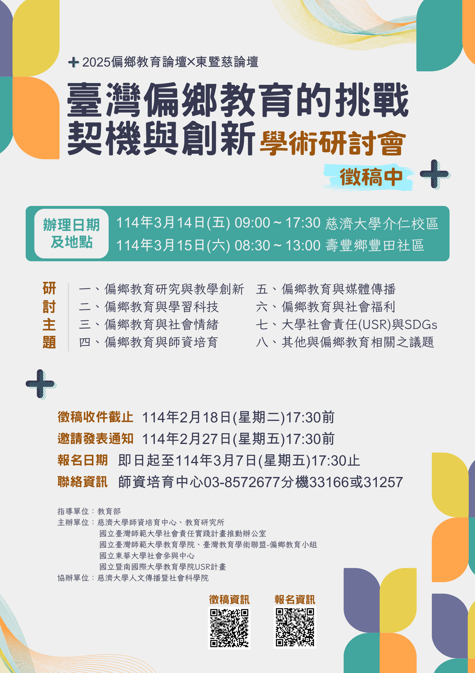 一、本次學術研討會以「偏鄉教育」為主軸,邀請國內專家學 者及實務工作者的發表與分享,從多面向探討偏鄉教育, 希冀能凝聚大眾偏鄉教育的意識,開啟偏鄉教育發展新的 思路和方向,期待能夠為偏鄉孩子們提供更好的教育機 會,讓他們能夠擁有公平、優質的教育。 二、徵稿主題如下: (一)偏鄉教育研究與教學創新。 (二)偏鄉教育與學習科技。 (三)偏鄉教育與社會情緒。 (四)偏鄉教育與師資培育。 (五)偏鄉教育與媒體傳播。 (六)偏鄉教育與社會福利。 (七)大學社會責任(USR)與SDGs。 (八)其他與偏鄉教育相關之議題。 三、重要日程如下: (一)徵稿收件截止:114年2月18日(星期二)17時30分前。 (二)邀請發表通知:114年2月27日(星期五)17時30分前。 四、徵稿注意事項、寄送方式以及相關資訊請參閱徵稿計畫(如 附件一)。 五、本次研討會投稿連結:https://forms.gle /PnKrLUWdRJQF2DHv8。 六、與會者參加研討會報名:即日起至114年3月7日(星期五)17 時30分前,連結https://forms.gle/s56hYtMYQQWa3x5bA報 名。 七、本研討會聯絡人:本校師資培育中心沈小姐、涂小姐,電 話:03-85672677轉33166、31257,電子信箱:lily@gms. tcu.edu.tw,相關訊息請連結網址http://www.cfte.tcu. edu.tw/。