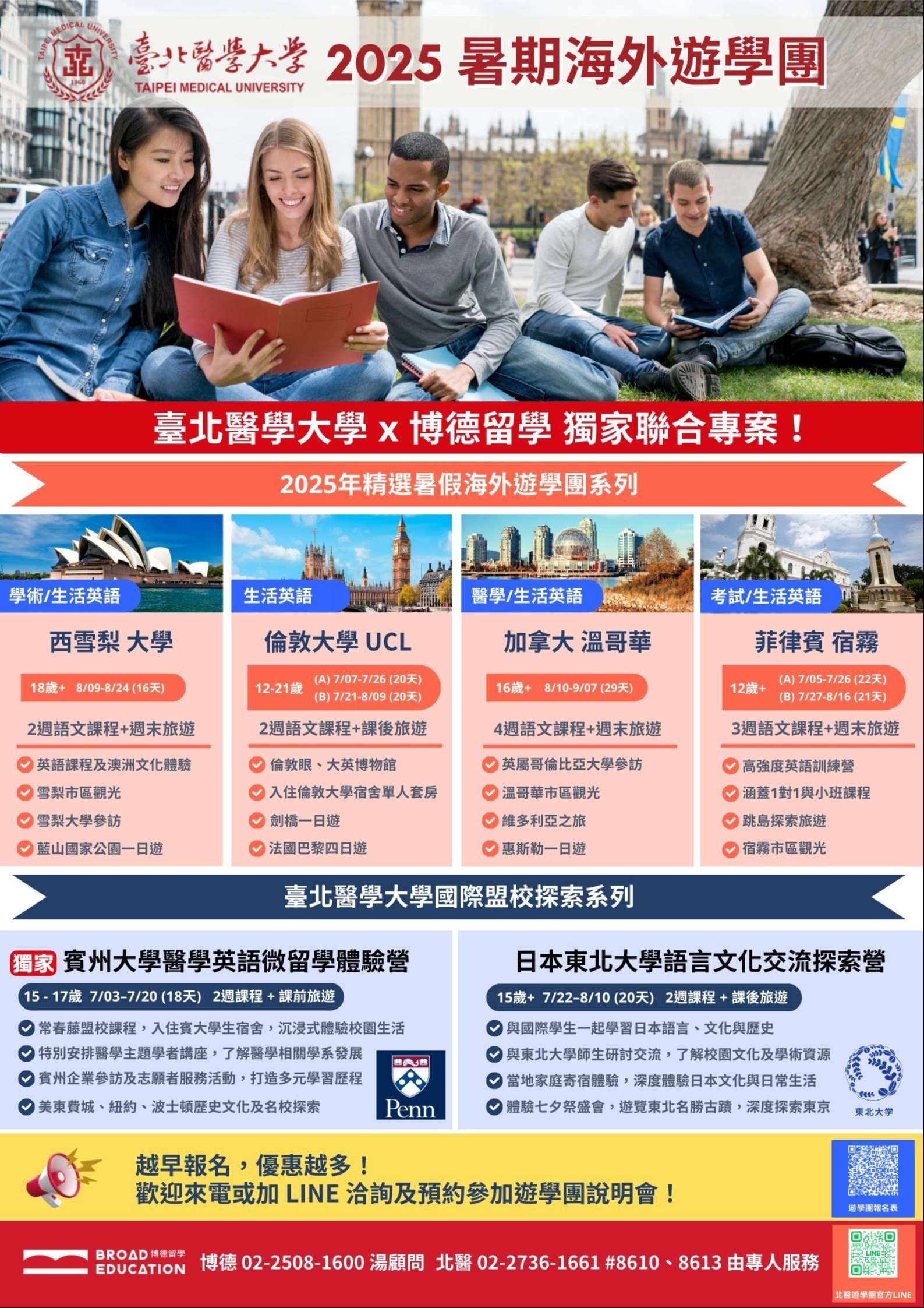今年度共舉辦八團,簡要資訊如下: (一)北醫國際盟校 - 賓州大學醫學英語微留學體驗營(2025 /07/03-2025/07/20,共18天),適合15-17歲學生。