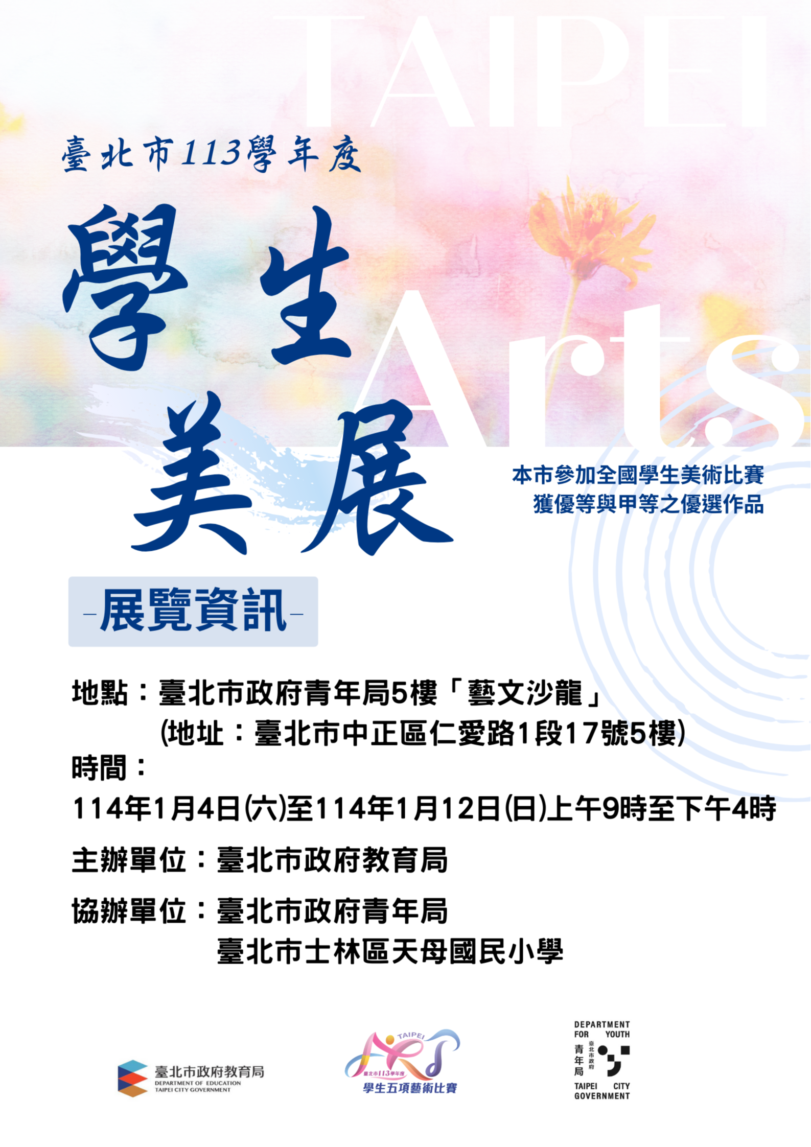 113學年度學生美展展覽資訊展覽地點 → 臺北市青年局5樓藝文沙龍 展覽期間 → 114.01.04 ━ 114.01.12開放時間 → 每日9:00-16:00