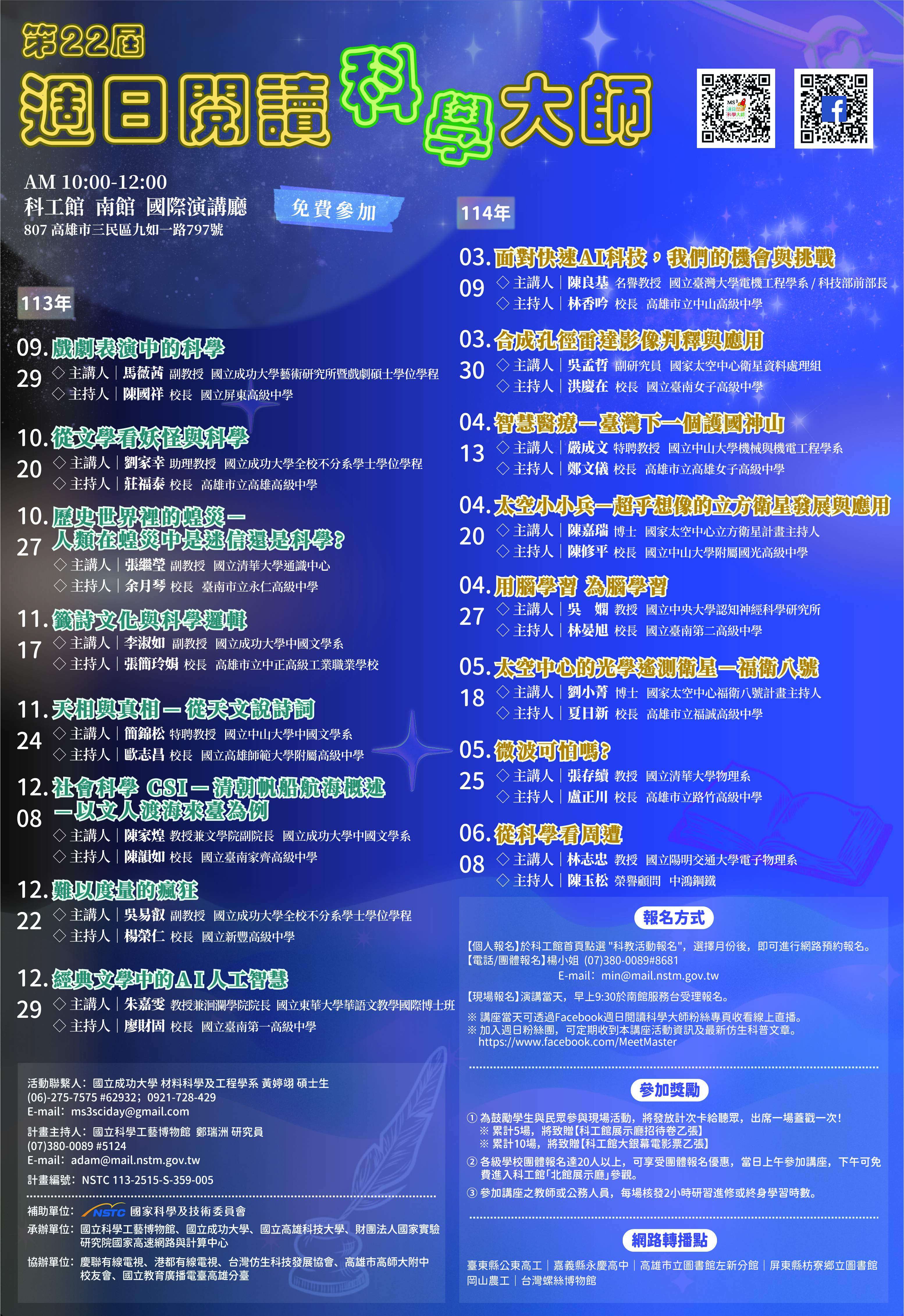 二、「週日閱讀科學大師」講座目的為引發學生及社會大眾對於科學的理解、興趣及參與,