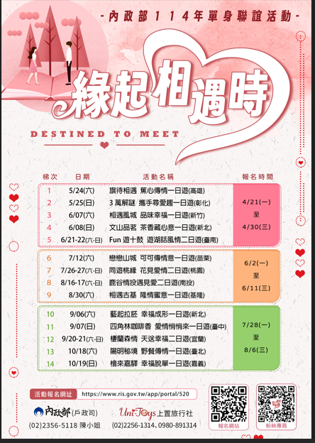 內政部114年「緣起相遇時」單身聯誼活動開跑了,共14梯次,歡迎踴躍參與,詳情請參閱內政部戶政司全球資訊網(https://www.ris.gov.tw/app/portal/520)。