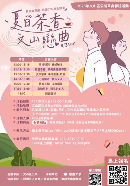 旨揭活動訂於114年8月31日(日)13:00至18:00假景美集應廟(臺北市文山區景美街37號)舉辦,線上報名時間自114年7月15日(星期二)中午12時起至114年8月12日(星期二)中午12時或額滿為止。