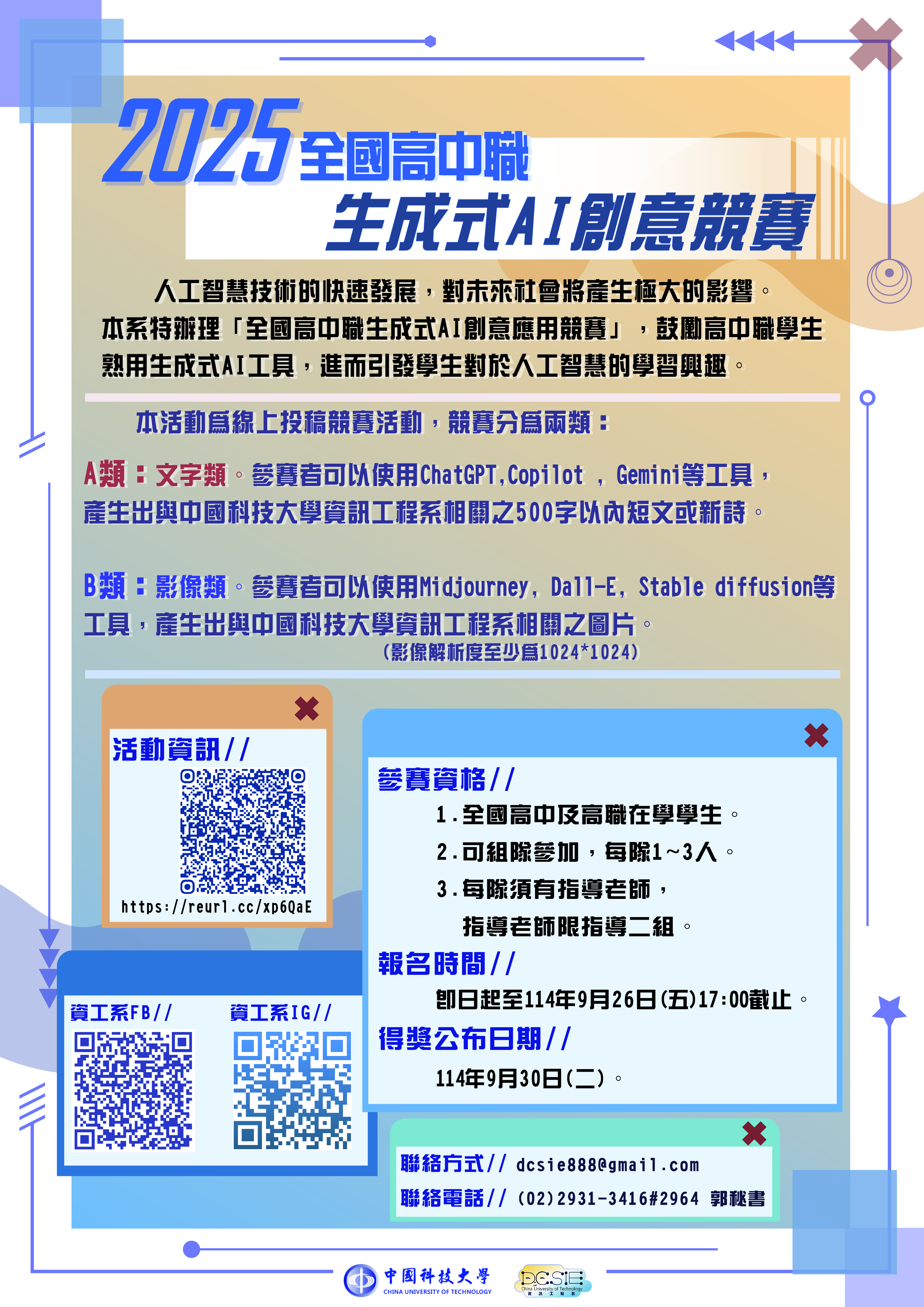 一、人工智慧技術的快速發展,對未來社會將產生極大的影響。中國科技大學資訊工程系特辦理「2025全國高中職生成式AI創意應用競賽」,鼓勵高中及高職學生熟用生成式AI工具,進而引發學生對於人工智慧的學習興趣。