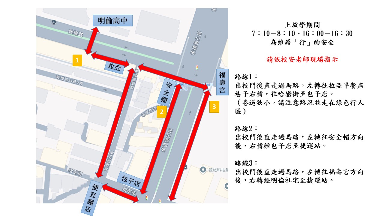 校園周邊上放學路線宣導,請同學們務必注意現場狀況及配合現場人員指揮行走。