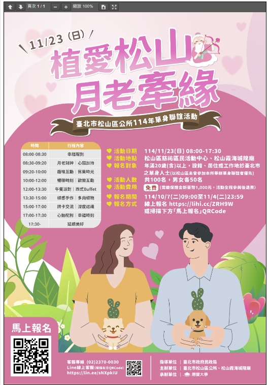 臺北市松山區公所『植愛松山 月老牽緣』單身聯誼活動,將於114年11月23日(星期日)08:00–17:30,於松山區慈祐區民活動中心、松山霞海城隍廟舉辦,自10月7日(星期二)09:00起受理線上報名至11月4日(星期二)23:59為止。