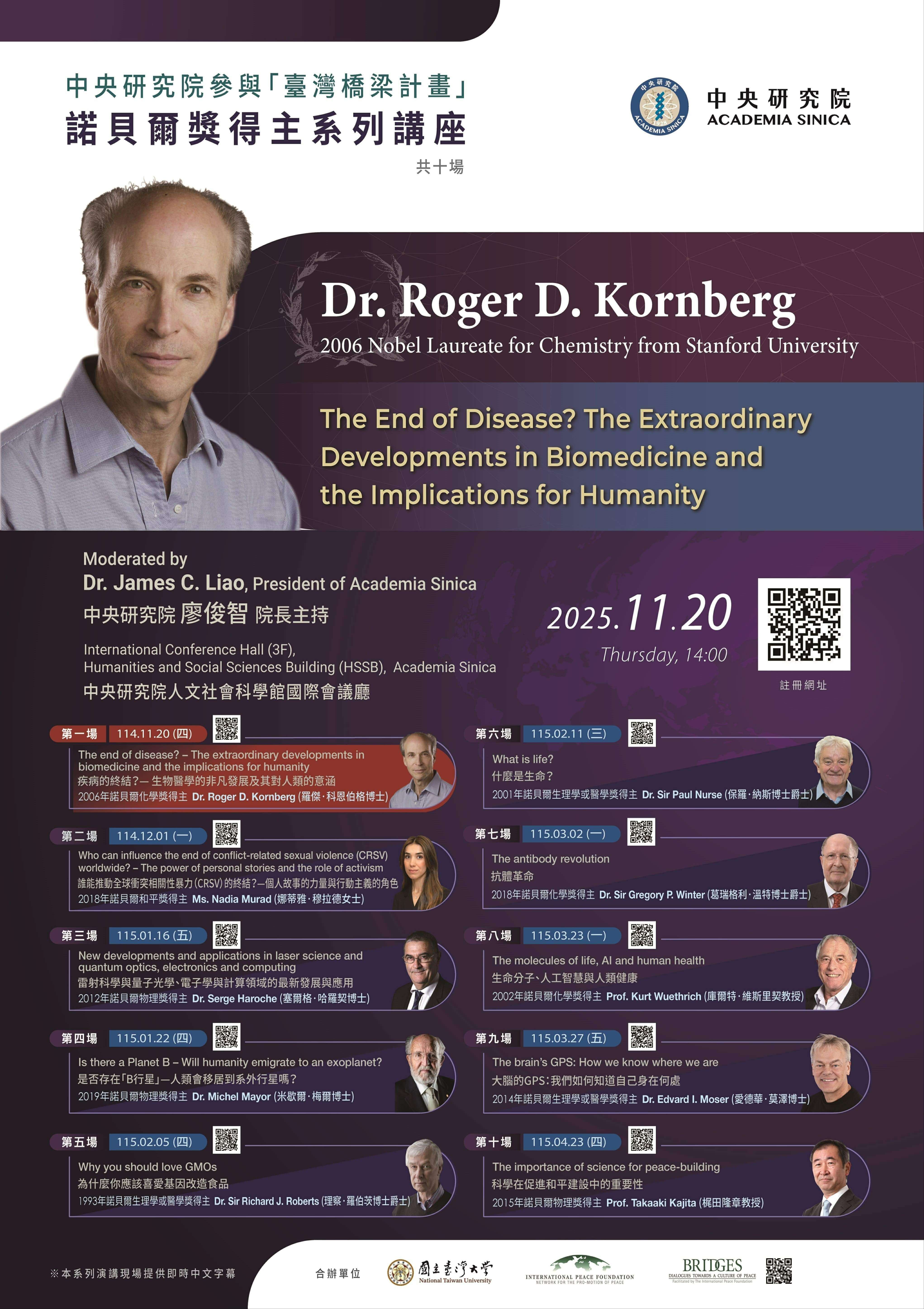 共將邀請 31 位諾貝爾獎得主訪問本院及全臺十餘所大學,
