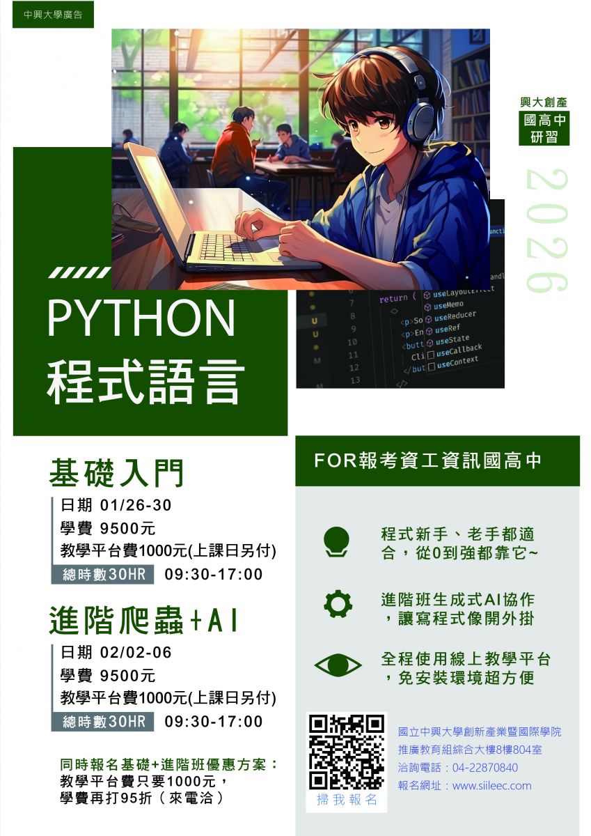 (一)Python程式設計-基礎入門:1月26日至30日五日營。