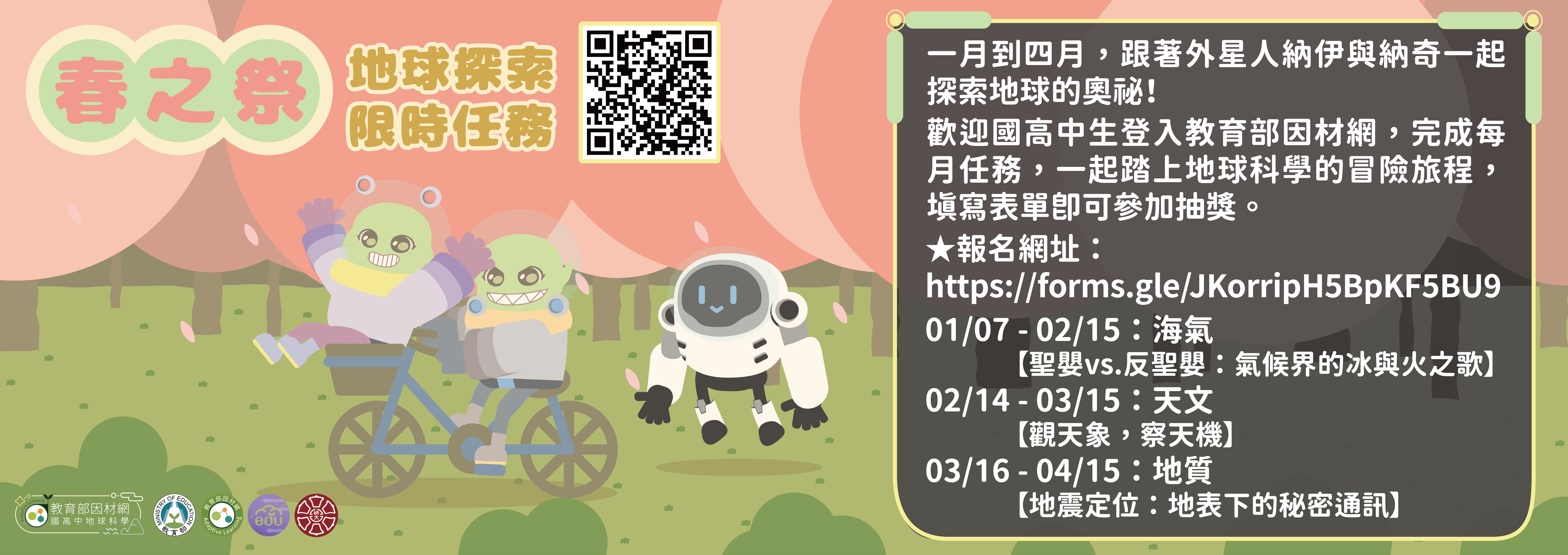 為促進學生自主探究與適性學習,推動親師生對於教育部因材網之推廣及應用,自115年1月7日起至115年4月15日特辦理「春之祭——地球探索限時任務」跨校學習活動,於期限內完成報名之國中及高中職學生即有機會參加科學好禮抽獎,敬請鼓勵學生踴躍參加。