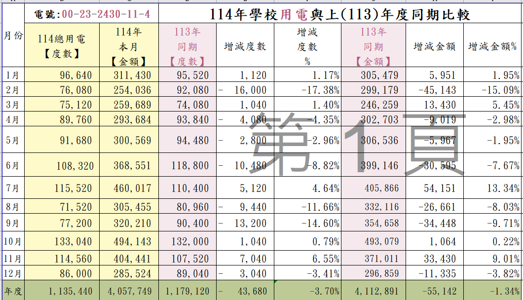 用電效率管理執行情形:依據台電公司電費單顯示,本校1月至12月用電量如下表所示,總電量為1135440度。比較113年同期總用電量減少43680度(3.7%)。