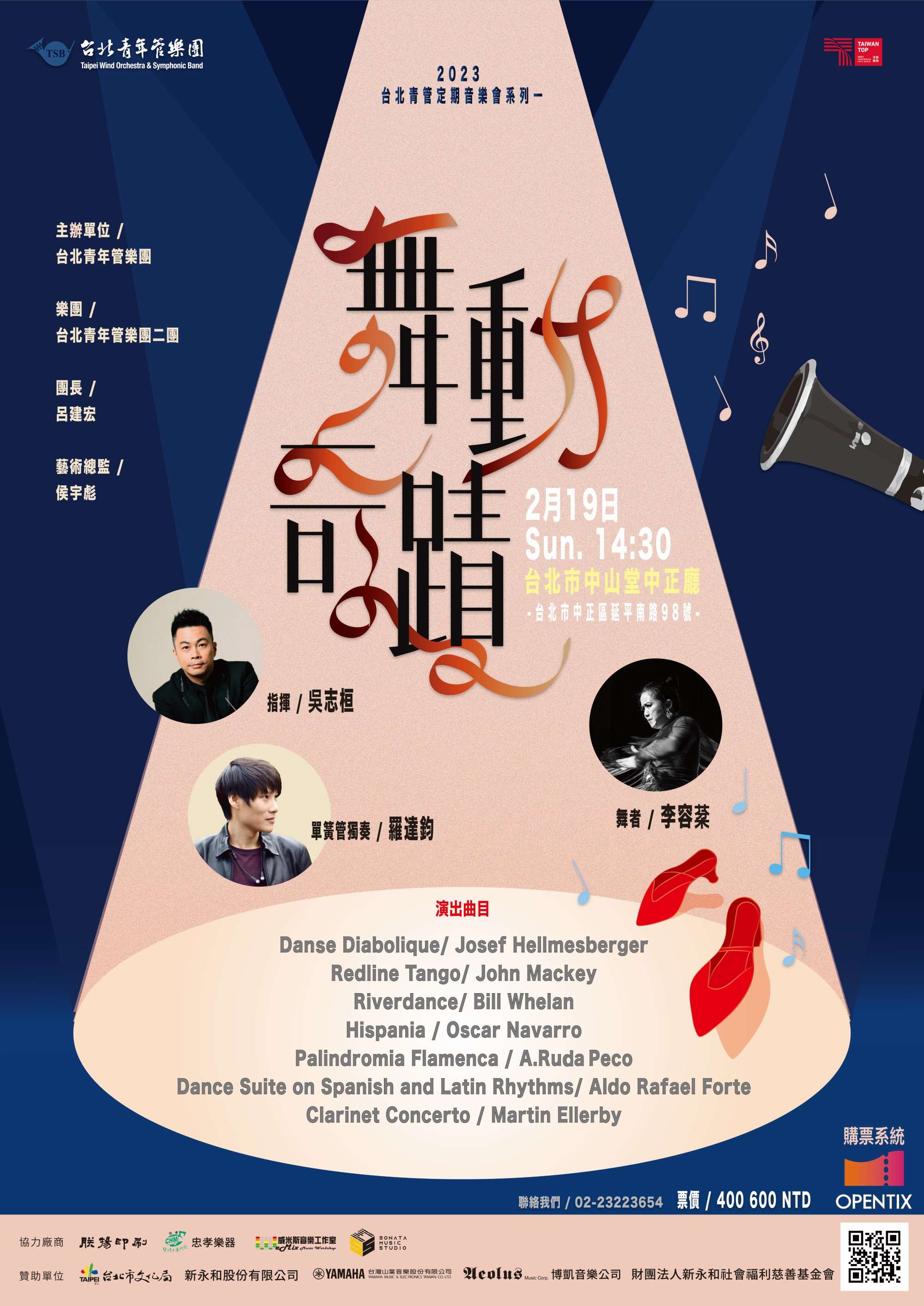 一、2023台北青管定期音樂會系列一,由台北青年管樂團二團演出、指揮吳志桓,並邀請佛朗明哥舞者李容棻同台演出,單簧管獨奏家羅達鈞演出協奏曲,帶來一連串好聽悅耳的舞曲,不可錯過。