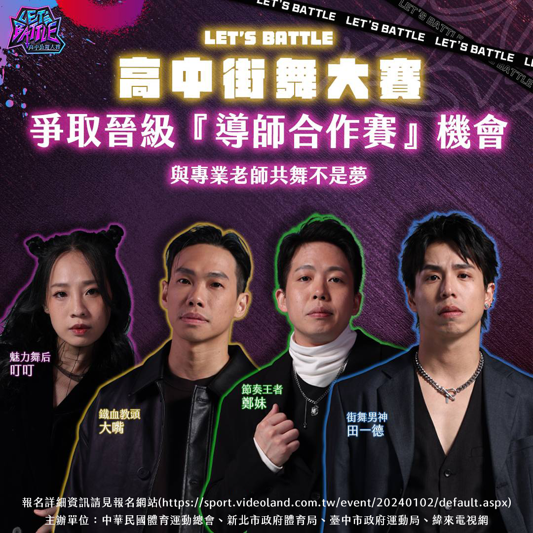 一、「Let`sBattle高中街舞大賽」由本會、新北市政府體育局、臺中市政府運動局及緯來電視網共同主辦,已於113年3月25日開放報名,為提升賽事知曉度及報名參賽人數,請貴局協助相關賽會宣傳事宜。
