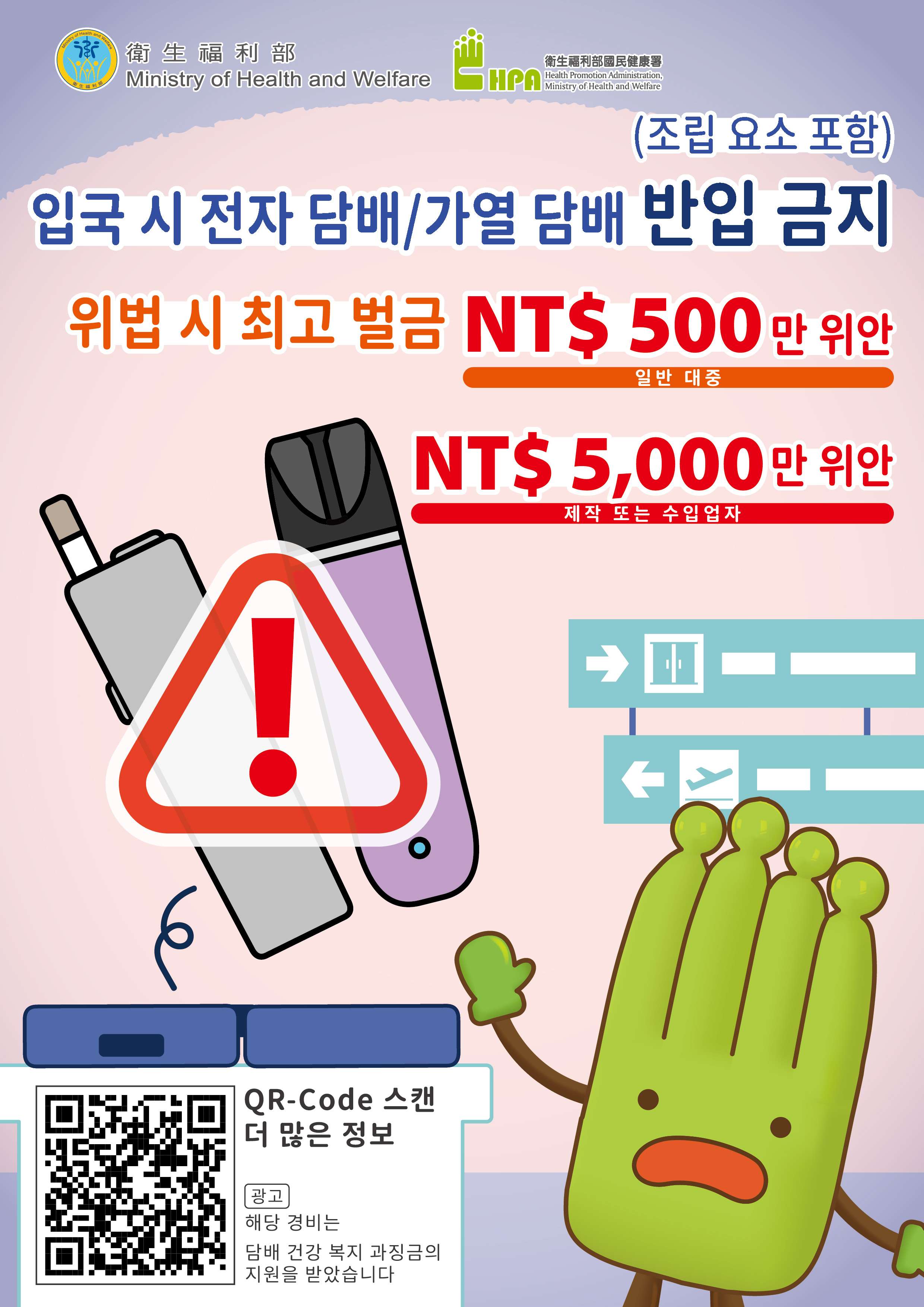 依菸害防制法第15條第1項第3款及同條第2項規定,任何人 不得輸入電子煙或未經核定通過健康風險評估審查之指定 菸品(加熱菸)及其必要之組合元件,目前尚無經衛生福利 部核定通過之指定菸品及其必要組合元件。違法輸入之業 者最高可處新臺幣5千萬元罰鍰;旅客攜帶電子煙或加熱菸 入境者,處新臺幣 5萬元至500萬元罰鍰。